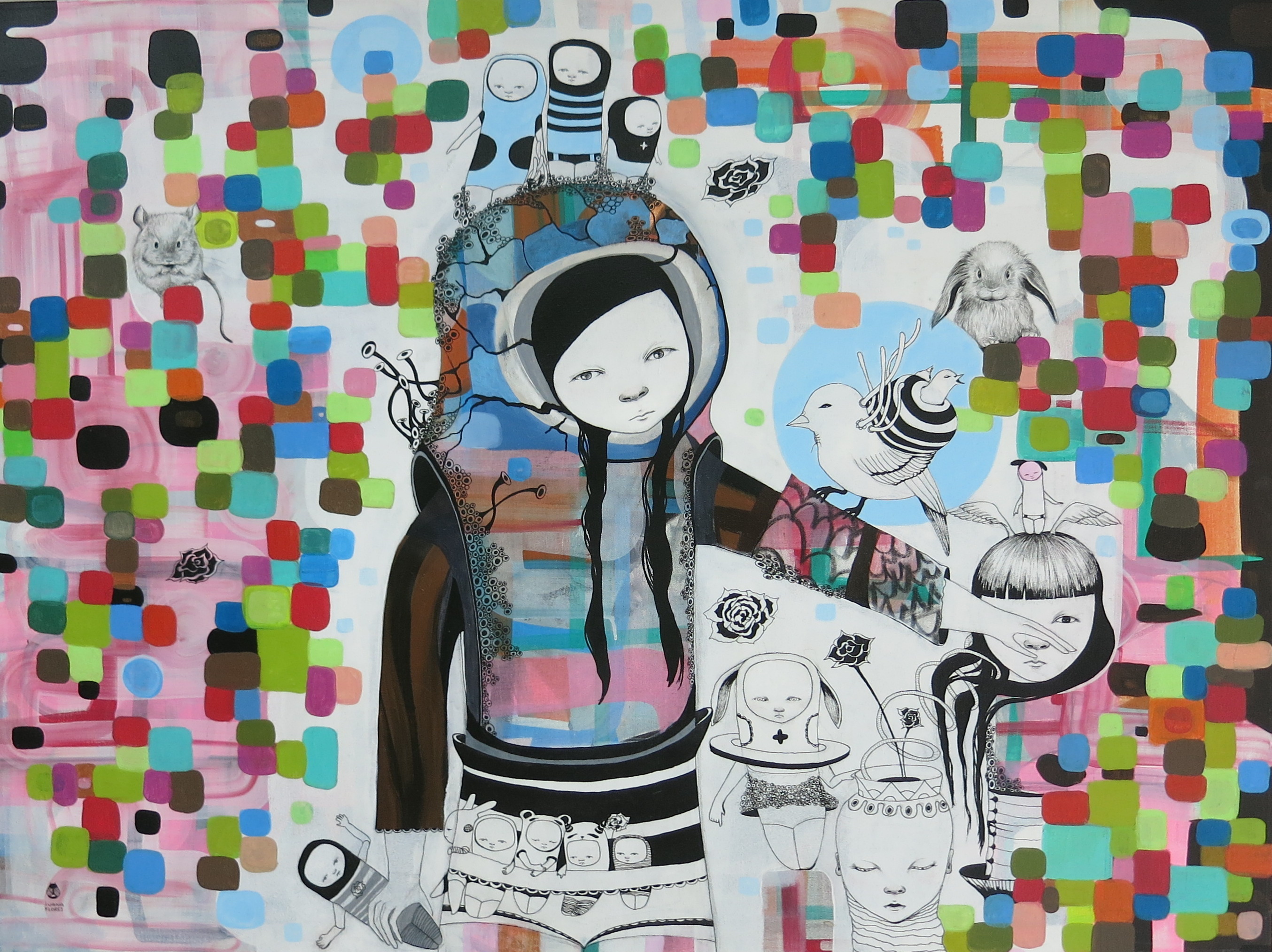 Ivana Flores .(Barcelona, 1974). La pintura y el dibujo son los lenguajes elegidos por Ivana Flores para sumergirnos en fantasías existenciales con trasunto real. Empezó su andadura expositiva participando en festivales de arte contemporáneo como el BAC (’01, ’02), organizado por La Santa, Barcelona; así como en J&B Party Project (Madrid); BarForum Bcn, y Barcelona Art District. Entre sus exposiciones individuales citamos las celebradas en el Convent de Bagur, La Cova de les Cultures 2011, Bcn; Convent de Sant Agustí, Bcn (2012, 2013); Pati Manning de Barcelona, 2013; El Bigote del Señor Smith, Barcelona, 2013. Ha participado en muestras colectivas organizadas por La Santa, la galería Iguapop (Barcelona, 2012); Virgin-Arch, 2013; Tallers Oberts, 2013; Urban Art Secrets 2013; Festival Weart 2013; Contemporary art fair Swab 2011, Swab 2012, entre otras ferias y festivales. Ivana combina lenguajes extraídos de fuentes diversas, desde el decorativismo art nouveau hasta el pop art, filtrado por su afinidad con el pop nipón y la estética kawaii. A través de ese sincretismo aborda temas relacionados con la construcción de la identidad en edades especialmente vulnerables, o la colisión entre una individualidad forjada como imagen pública y el yo más íntimo. En ocasiones despliega sobre el lienzo laberintos cartografiados por mentes fantasiosas que dan vida a pequeñas criaturas que se reproducen cuál esporas. En otras, mujeres adolescentes aparecen aprisionadas entre efervescencias moleculares o recostadas sobre lechos multicolor. O bellos rostros hechos de retales ocultan los rasgos personales en juegos de máscaras y evasión.