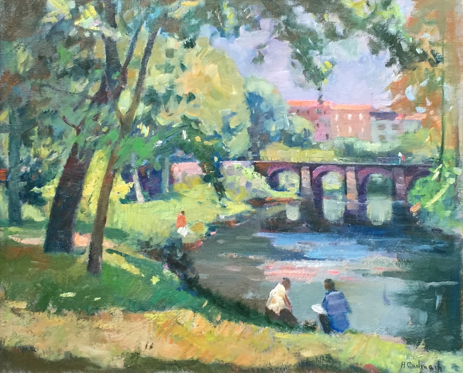 Ángel Codinach Campllonch nació en Olot el 11 de febrero de 1922 y murió el 21 de julio de 1995 en Girona. La vocación por la pintura de Ángel Codinach se manifestó ya en su infancia. Sus inicios artísticos, siempre difíciles, se apoyaron con la ayuda de su padre, gran amante de la escultura y tallista aficionado, el cual, desgraciadamente, moriría muy pronto. Este hecho, acontecido cuando Codinach sólo tenía trece años, condicionaría decisivamente su futura trayectoria personal y artística. Durante cuatro años se formó en la Escola de Belles Arts d’Olot, donde estudió dibujo y pintura bajo la dirección de los artistas Melchor Domenge, Martí Casadevall, Pere Gussinyé y el escultor Abel Ferrarons entre otros. A principios de los años 50 formó parte del grupo Cráter d’ Art y Grup de Pintors d’Olot impulsado y dirigido por Josep Mir y Mas de Xerás, con el Dr. Candi Agustí, etc. Se trataba de un núcleo compuesto por más de treinta artistas plásticos, de muy diversas tendencias, que aspiraban a una renovación de la orientación tradicional del arte olotino. No renegaban del glorioso pasado artístico de la capital de la Garrotxas, pero lo entendían como una lección ya asumida. El grupo lo integraban diversos pintores, entre los cuales, a parte del mismo Codinach, estaban Rafael Griera, Joan Clapera i Maya, los ya desaparecidos Frederic Comelles, Josep Mª Vayreda Canadell, Danés Jordi, etc. Habitaban como local permanente una parte del bar La casa del Moro y expusieron regularmente en el Principado. En Barcelona lo hicieron concretamente los años 1954 y 1956. El 1954 fue también el de la presentación de Àngel Codinach, que tuvo lugar en la Sala Armengol, de su ciudad natal. Posteriormente fue miembro del grupo Pintors d’ Olot, con Griera, Bataller, Corriols, Gómez y otros, exponiendo con ellos en diversas poblaciones de las comarcas catalanas, en Barcelona, Valencia y Bilbao a principios de los años 60. En viajes patrocinados por la Galería Mundi Art, de Barcelona, visitó diversas ciudades de Castilla y León entre 1971 y 1972. Hombre trabajador y que no concibe que en el arte existan elementos competitivos, no ha querido, en ningún momento de su carrera, participar en concursos. Recientemente le ha sido concedidala Medalla d’Argent del Ayuntamiento de El Prat de Llobregat. Tal y como ha remarcado Lina Font, Ángel Codinach es un paisajista que insertado en las corrientes conceptuales del postimpresionismo, se caracteriza por la agilidad de la digitación, la fluidez de los empastes y el claro entendimiento y original enfoque del tema. Por su lenguaje expresivo se vale de una amplia gama cromática de tonos brillantes, armonizada con sensibles matizaciones que logra por sobreposición del pigmento. Conocida y reconocida su categoría dentro del círculo pictórico, empieza a ser relanzado por personas entusiastas de su obra que con una dedicación casi absoluta consiguen introducirlo en casi todo el mundo. Actualmente de una manera discreta pero continuada la obra de nuestra amigo Ángel es posible disfrutarla en treinta y cinco países diferentes y en sitios tan distantes y de grandes diferencias culturales como para poder decir con toda seguridad que Ángel Codinach es un artista de renombre mundial. El tiempo y no nosotros nos dará sin duda la razón.