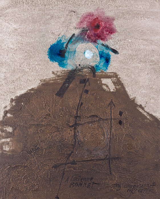 Modest Cuixart i Tàpies (Barcelona, 1925 – Palafrugell, Girona, 2007) ,estudió inicialmente medicina, pero pronto abandona sus estudios para dedicarse a la pintura, e ingresa en la Academia Libre de Pintura de Barcelona. En 1948 participa en la fundación del grupo Dau al Set, junto con Brossa, Ponç, Tàpies y Tharrats, entre otros. Preocupado por el valor plástico del signo, su obra tiene desde el principio un fuerte parentesco con el surrealismo, así como una gran sensibilidad hacia la fuerza expresiva del color. Hacia 1955 se sumerge en el informalismo matérico, que le llevará a utilizar el “grattage” en obras de cierto regusto orientalizante. En 1959 gana el primer premio de la Bienal de São Paulo y expone en la Documenta de Kassel, y al año siguiente participa en una exposición de vanguardia española celebrada en la Tate Gallery de Londres y en el Museo Guggenheim de Nueva York. Cuixart introduce en su obra el collage en 1962, lo que le llevará poco a poco hacia el pop-art. Enriquecido por todas estas experiencias, vuelve de nuevo a la pintura plana, alcanzando un realismo crítico muy personal, que sintetiza el expresionismo con la figuración dramáticamente transformada, siempre valorando las cualidades cromáticas. En los años setenta expone en numerosas capitales nacionales e internacionales, como París, Madrid, São Paulo, Ámsterdam, Tokio, Basilea, Barcelona y Milán, entre otras. En la década siguiente, Cuixart va liberando a su pintura de los aspectos agresivos para darle un tono más lírico. Además, participa en una exposición colectiva en el Palacio de la UNESCO de París, recibe la Cruz de San Jorge de la Generalitat de Cataluña, y la Cruz de Isabel la Católica. En 1988 realiza una exposición antológica en Japón, en las ciudades de Kobe y Tokio. Continúa trabajando con colores y formas exuberantes, y reincorpora a su obra una figuración más matérica. En 1998 se crea la fundación que lleva su nombre en Palafrugell, y al año siguiente se le concede la Medalla de Oro al mérito en las Bellas Artes del Ministerio de Cultura. Está representado en el Museo Nacional Centro de Arte Reina Sofía, la Tate Gallery de Londres, el Nacional de Arte de Cataluña, los de Arte Contemporáneo de Madrid, Barcelona y Saint-Etienne (Francia), el Patio Herreriano de Valladolid, el de Grabado Español Contemporáneo de Marbella, el de Arte de la Universidad de São Paulo, el de Arte Abstracto de Cuenca y el del Ampurdán, entre muchos otros.