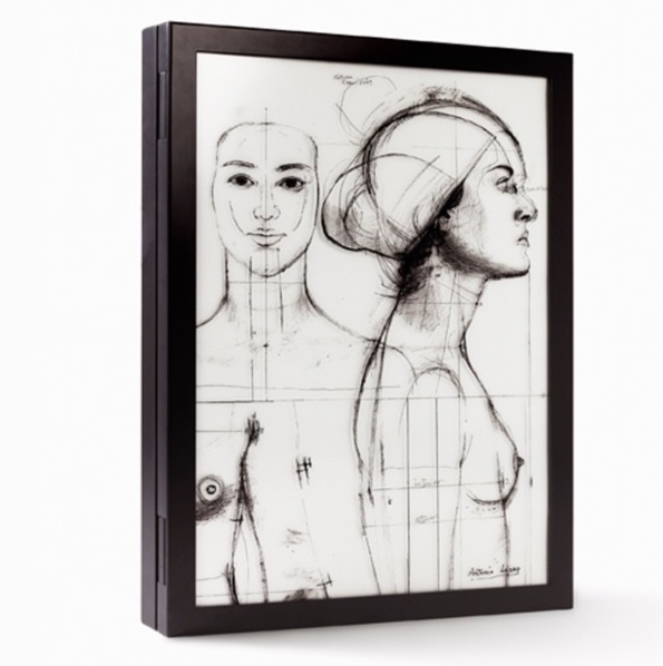 Estoig de fusta i vidre, serigrafiat a 2 tintes, per el libre «Cuerpos y Flores», mides 77 x 54,4 x 8 cm.