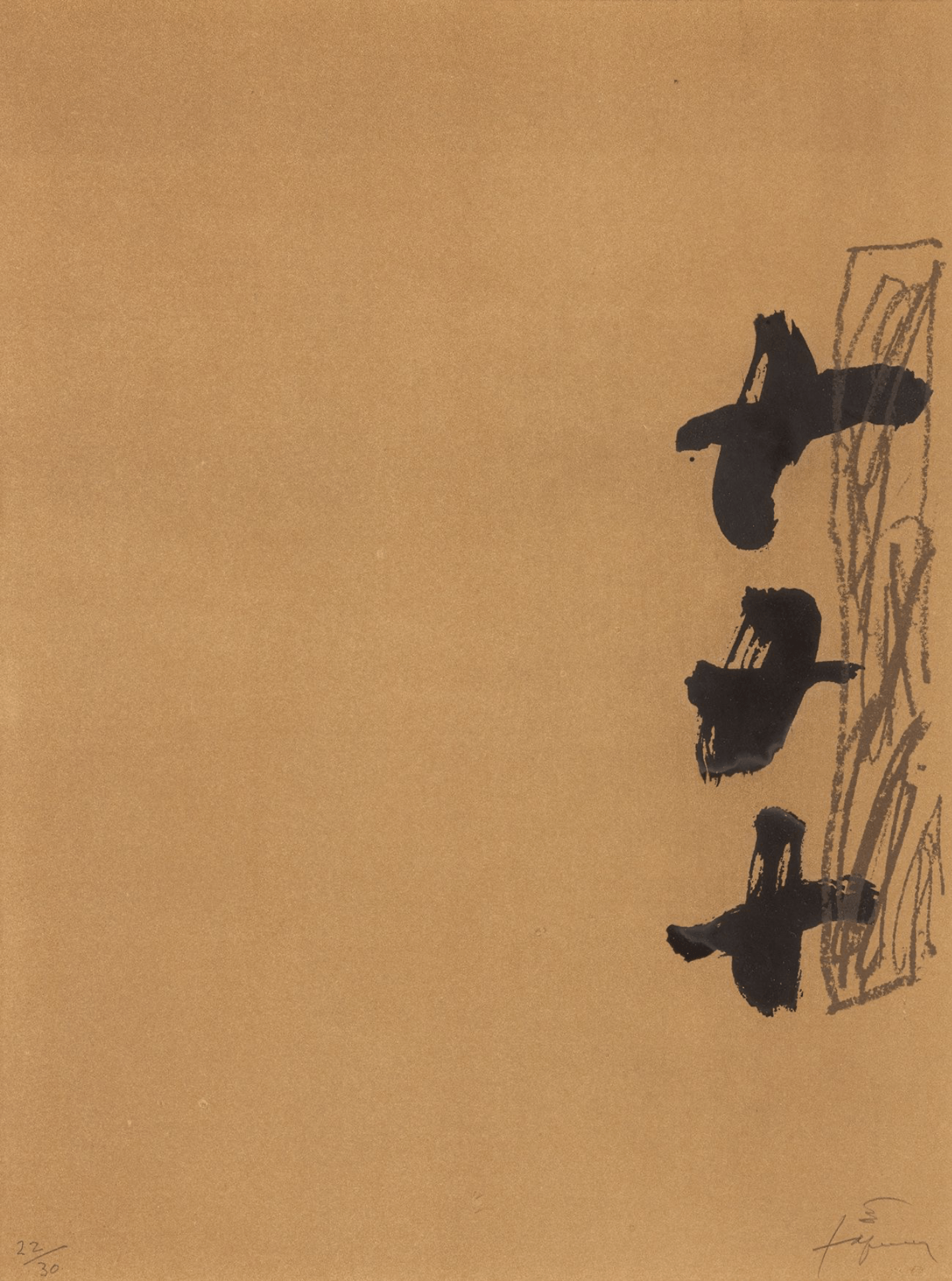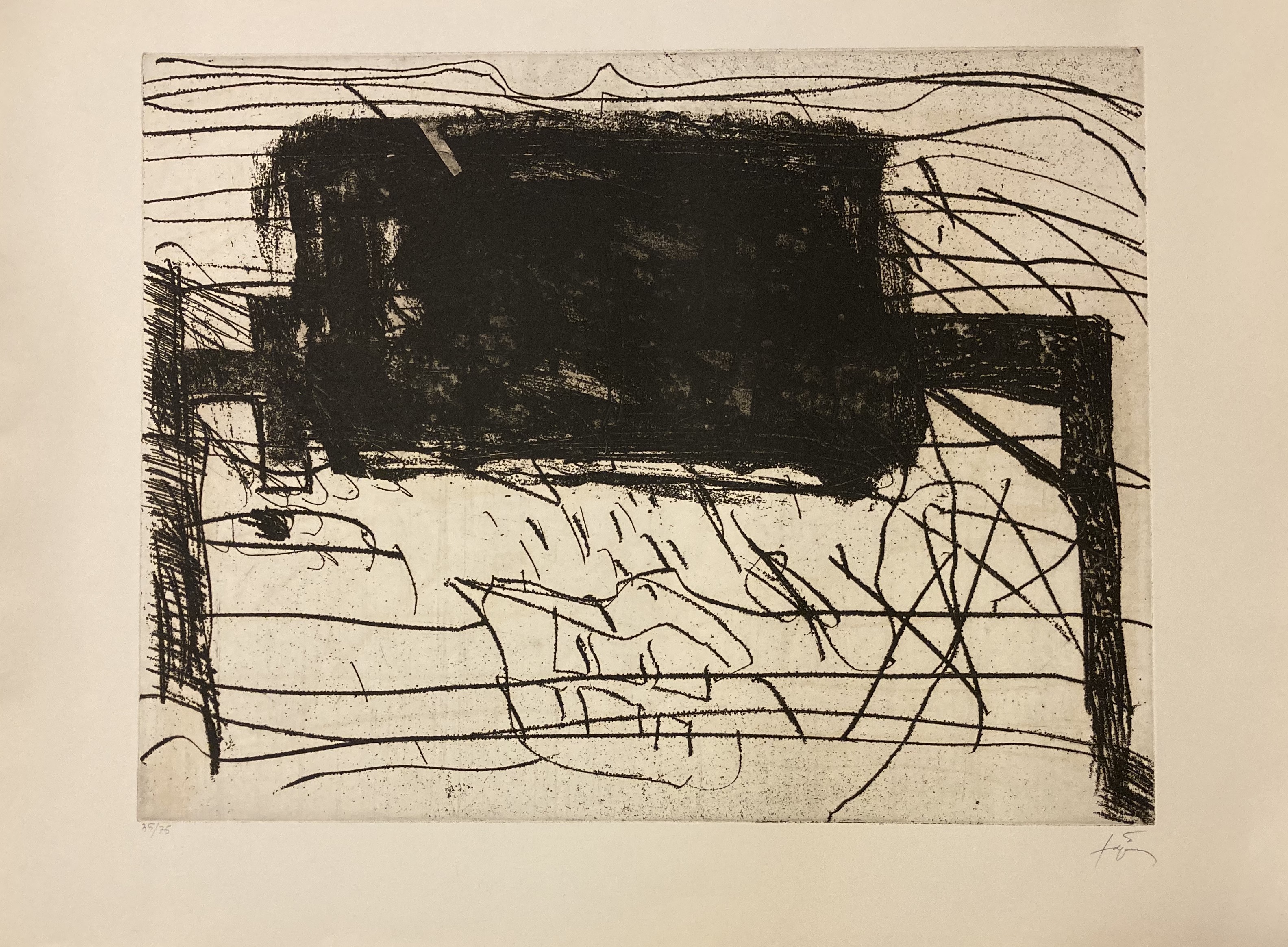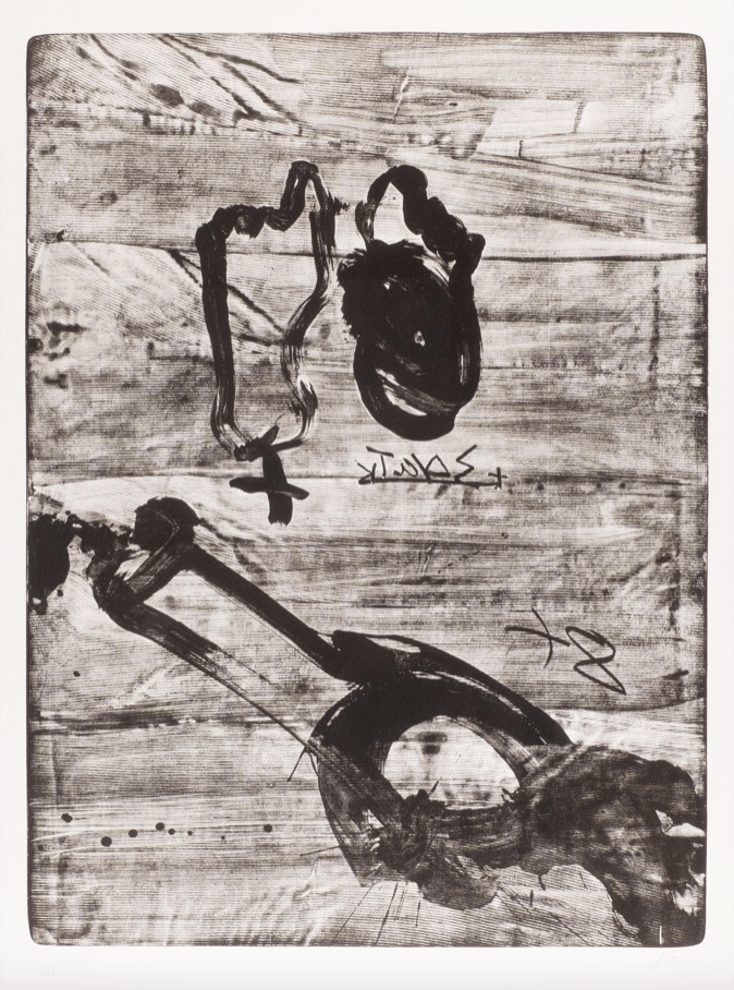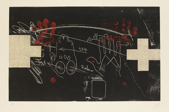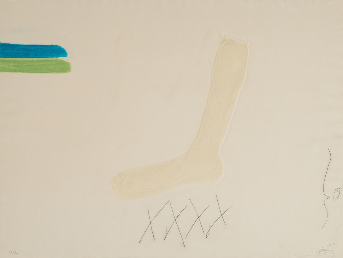 Paral·lelament a la producció pictòrica i objectual, Tàpies ha anat desenvolupant des de 1947 una activitat intensa en el camp de l’obra gràfica. En aquest sentit convé destacar que l’artista ha realitzat un gran nombre de llibres de bibliòfil i carpetes en estreta col·laboració amb poetes i escriptors com Alberti, Bonnefoy, Du Bouchet, Brodsky, Brossa, Daive, Dupin, Foix, Frémon, Gimferrer, Guillén, Jabès, Mestres Quadreny, Mitscherlich, Paz, Saramago, Takiguchi, Ullán, Valente i Zambrano, entre d’altres.