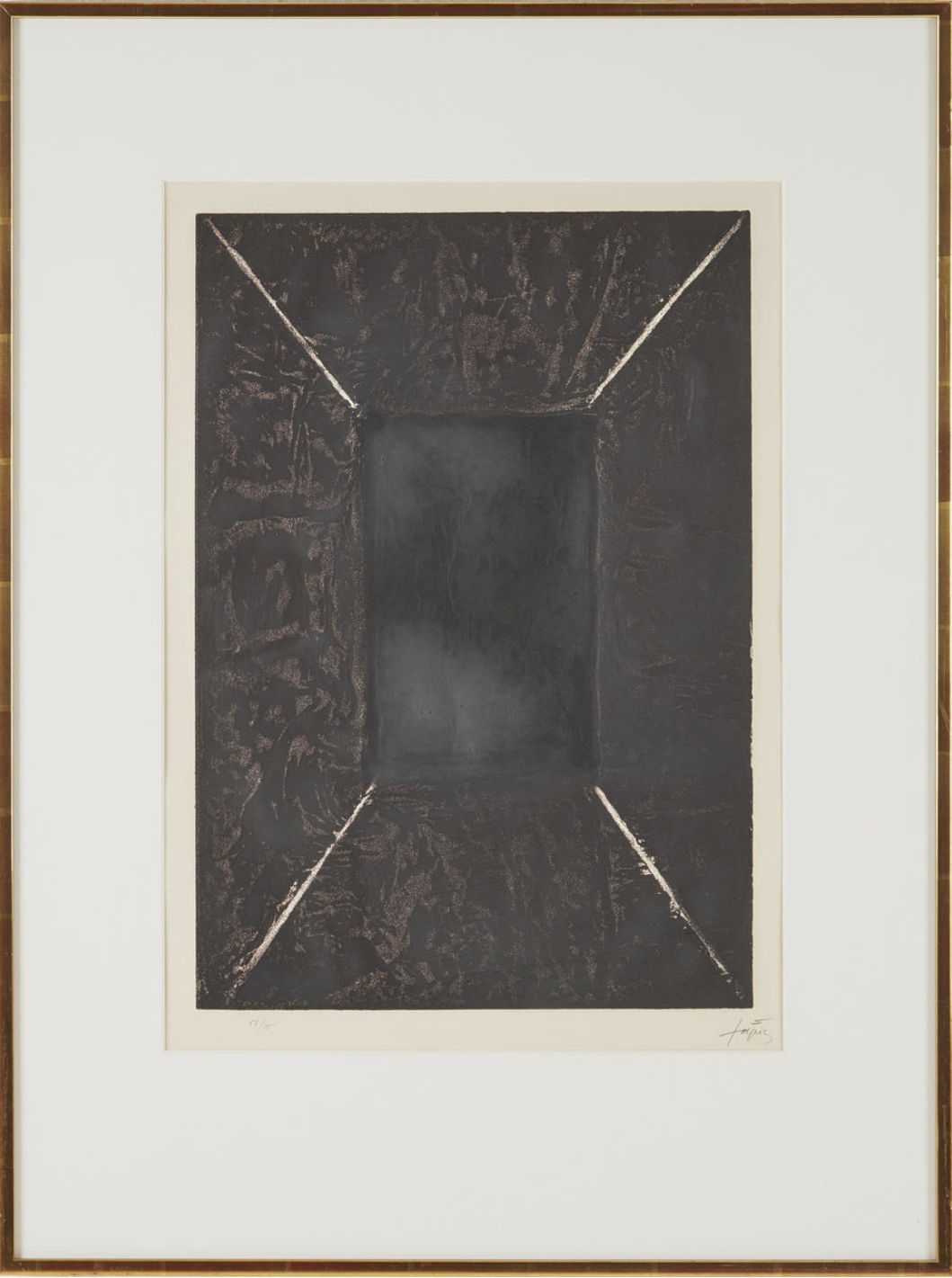 Antoni Tàpies neix a Barcelona el 1923 en el si d’una família burgesa, culta i catalanista, immersa des de mitjan segle XIX en una tradició editorial i llibretera que ben aviat desperta en l’artista un amor pels llibres i la lectura. Aquesta predisposició es veu accentuada en la llarga convalescència d’una malaltia pulmonar, durant la qual inicia els seus tempteigs artístics. Progressivament es dedica amb més intensitat al dibuix i a la pintura, i acaba deixant els seus estudis de dret per dedicar-s’hi plenament. En la dècada dels anys quaranta ja exposa les seves obres, les quals destaquen en la panoràmica artística del moment. Partícip d’una sensibilitat generalitzada que afecta els artistes d’ambdues bandes de l’Atlàntic arran de la Segona Guerra Mundial i el llançament de la bomba atòmica, Antoni Tàpies expressa des de ben aviat un interès per la matèria, la terra, la pols, els àtoms i les partícules, que es plasma formalment en l’ús de materials aliens a l’expressió plàstica academicista i en l’experimentació de noves tècniques. Les pintures matèriques formen una part substancial de l’obra de Tàpies i constitueixen un projecte que es continua desenvolupant avui dia. Tàpies creu que la noció de matèria s’ha d’entendre també des de la perspectiva del misticisme medieval com a màgia, mimesi i alquímia. És en aquest sentit que hem de comprendre el desig de l’artista que les seves obres tinguin el poder de transformar el nostre interior. Durant els anys cinquanta i seixanta Antoni Tàpies anirà elaborant un seguit d’imatges, generalment extretes del seu entorn immediat, que apareixeran en les diferents etapes de la seva evolució. Sovint, una mateixa imatge, a més de ser representada de diverses maneres, tindrà una sèrie de significacions diferenciades que s’aniran superposant. El seu missatge se centra en la revaloració del que es considera baix, repulsiu, material (no és en va que Tàpies escull sovint temes tradicionalment tinguts per desagradables i fetitxistes, com poden ser un anus defecant, una sabata abandonada, una aixella, un peu i d’altres). Així mateix, l’obra d’Antoni Tàpies ha estat sempre permeable als esdeveniments polítics i socials del moment. A finals dels anys seixanta i començament dels setanta, el seu compromís polític contra la dictadura s’intensifica, i les obres d’aquest període tenen un marcat caràcter de denúncia i de protesta. Coincidint amb l’eclosió de l’arte povera a Europa i el postminimalisme als EUA, Tàpies accentua el seu treball amb objectes, no mostrant-los tal com són, sinó imprimint-los el seu segell i incorporant-los al seu llenguatge. A principis dels anys vuitanta, un cop restaurat l’Estat de dret a Espanya, l’interès de Tàpies per la tela com a suport adquireix una força renovada. Durant aquests anys, realitza obres amb goma-escuma o amb la tècnica de l’esprai, utilitza vernissos i crea objectes i escultures de terra xamotada o de bronze, alhora que es manté molt actiu en el camp de l’obra gràfica. D’altra banda, a finals dels anys vuitanta sembla que es reforça l’interès de Tàpies per la cultura oriental, una preocupació que ja s’havia anat gestant des dels anys de la postguerra i que esdevé, cada vegada més, una influència filosòfica fonamental en la seva obra pel seu èmfasi en el que és material, per la identitat entre home i natura i per la negació del dualisme de la nostra societat. Igualment, Tàpies se sent atret per una nova generació de científics, els quals contribueixen a donar una visió de l’univers que entén la matèria com un tot en un canvi i formació constants. Les obres dels darrers anys constitueixen, sobretot, una reflexió sobre el dolor -tant físic com espiritual- entès com a part integrant de la vida. Influït pel pensament budista, Tàpies considera que un major coneixement del dolor permet fer més dolços els seus efectes i, per tant, millorar la qualitat de vida. El pas del temps, que sempre ha estat una constant en l’obra de Tàpies, adquireix ara nous matisos en viure’s com una experiència personal que comporta un millor autoconeixement i una comprensió més clara del món que l’envolta. Durant aquests darrers anys, Antoni Tàpies ha consolidat un llenguatge artístic que tradueix plàsticament, d’una banda, la seva concepció de l’art i, de l’altra, unes preocupacions filosòfiques renovellades amb el pas del temps. La seva pràctica artística continua permeable a la brutalitat del present, a la vegada que ofereix una forma que, tot i la seva ductilitat, roman fidel als seus orígens. En aquest sentit, les obres dels últims anys no tan sols s’inscriuen en la contemporaneïtat, sinó que també són un registre del propi passat de l’artista. Paral·lelament a la producció pictòrica i objectual, Tàpies ha anat desenvolupant des de 1947 una activitat intensa en el camp de l’obra gràfica. En aquest sentit convé destacar que l’artista ha realitzat un gran nombre de llibres de bibliòfil i carpetes en estreta col·laboració amb poetes i escriptors com Alberti, Bonnefoy, Du Bouchet, Brodsky, Brossa, Daive, Dupin, Foix, Frémon, Gimferrer, Guillén, Jabès, Mestres Quadreny, Mitscherlich, Paz, Saramago, Takiguchi, Ullán, Valente i Zambrano, entre d’altres. Així mateix, Antoni Tàpies ha desenvolupat una tasca d’assagista que ha donat lloc a una sèrie de publicacions, algunes traduïdes a diversos idiomes: La pràctica de l’art (1970), L’art contra l’estètica, (1974), Memòria personal (1978), La realitat com a art (1982), Per un art modern i progressista (1985), Valor de l’art (1993) i L’art i els seus llocs (1999).