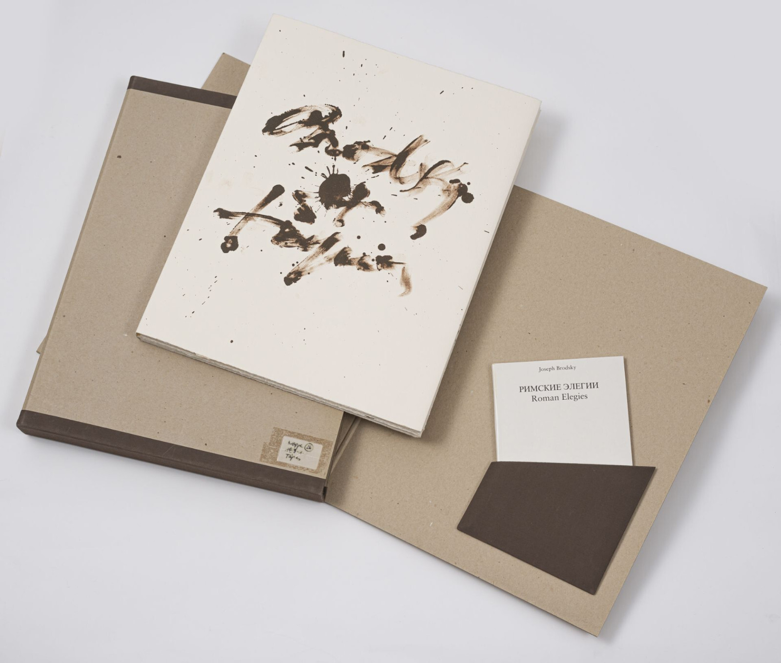 Llibre amb text de Joseph Brodsky i litografíes de Antoni Tápies, sobre paper Arches, exemplar 24/50. Referencia Galfetti 1409 al 1423, mides libre 36,7 x 28,7 cm.